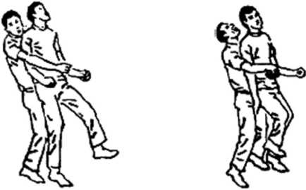 对手-手从背后勒住我脖子,一手抓住我右臂,我身体向 右摆动,同时以左手后肘撞击对手肋骨,如图1105-1106.