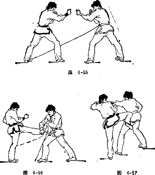 我右预备姿势,对方左预备姿势站立(见图6-55)o我左 腿向前攻击对方腹部,对方左手向下、向外拨防(见图6,56)。 我左脚向前落地,靠近对方,两手抓拉对方左臂,同时用右膝 顶击其腰后部(见图6-57)。要点,落步进身要快,抓握要紧,拉臂与顶击要同时用 力。