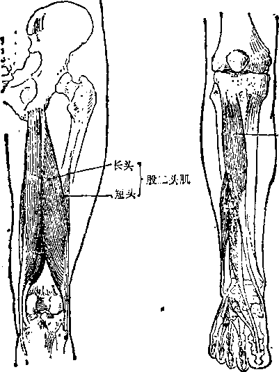 胫骨前肌位于胫骨的外侧(见图2-20)o近固定时,使足 伸(背屈)、内收和旋外,如侧踹腿法中脚尖勾起动作。远固定 时,拉小腿向前,维持足弓。采用脚尖勾起用脚跟走的方法训练,可发展胫骨前肌的 力量。图2T9大腿肌后面(右) 图2-20小腿前面《右)