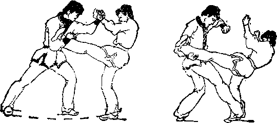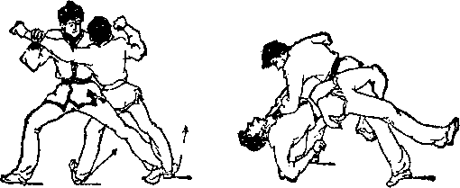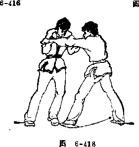 对方用左拳进攻我身体中、上部时,我身体稍右转,两臂 防守(见图6-418),右脚向对方左腿后插入,同时右手抓住对 方手腕,左手掐喉部(见图6-419),上体继续右转,右手随转 体向右牵拉,左手用力推压左腿绊住对方左腿,将其摔在地上(见图6-420)o要点‘进步后要紧紧贴靠对方身体,要依靠转体、拧腰之 力,绊腿时两脚不要移动。留 6-419留 6-419图 6-420图 6-420留 6-419留 6-419图 6-420图 6-420
