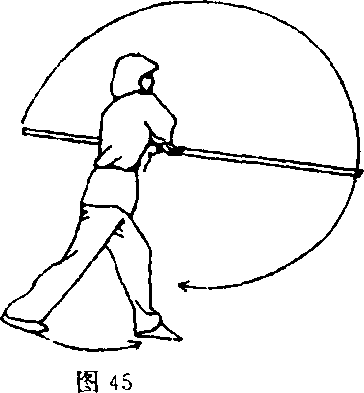 ①左脚上一步,重心移至左腿,右脚跟提起,身体随之右 转,两手握棍,两臂交叉不变;目视前方(图45)。