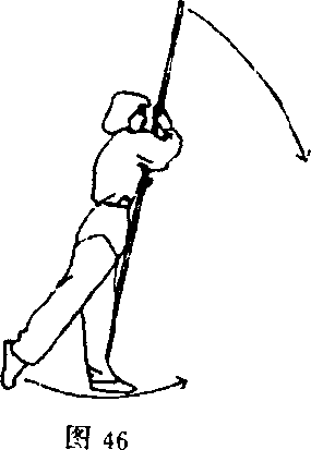 ②身体立起,重心移至左前脚掌;同时,右手握棍将棍把由 后向上绕行,右手在上,左手在下;目视前方(图46)。