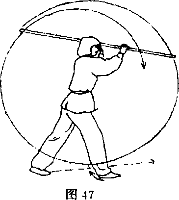 ③右脚上前一步落实,左 脚跟提起,身体略右转;随之 棍把继续向前绕行至胸前,右 手握棍在前,左手握棍于头的 左侧;目视前方(图47)。