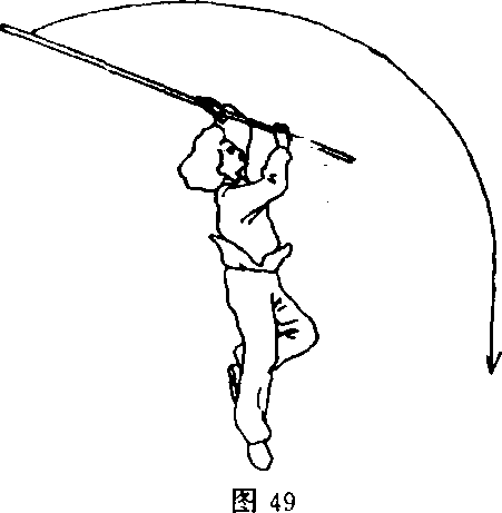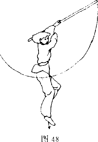 ⑤右脚落地;两手握棍,将棍梢迅速由前上方沿身体外侧两 臂交叉舞花移向右后方,右臂在前,左臂在头上方举棍;目视前 方(图49)O