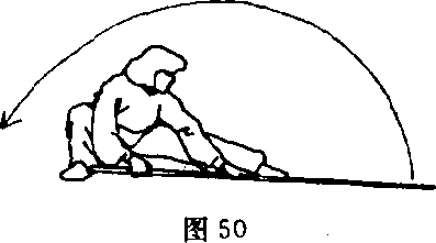 ⑥整个重心迅速下移,右 腿屈膝下蹲,左腿由屈到伸成 左仆步,身体前倾;同时,棍 由上向地面摔棍,右手握棍屈 时略高于地面,将棍把端略向 上用力,左掌心按棍,向下用 力,两手上下反作用力;目视 棍梢(图50)。