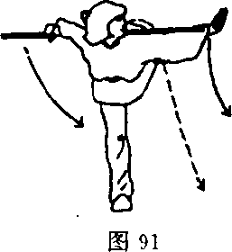 ①上体抬起左脚落地为实,重心移至左腿,右脚掌着地,身体 右转;同时,右手握棍棍把由上向下至右腿前方斜下隔棍左臂由上 向右斜后方摆掌;目视右斜下方(图92)。