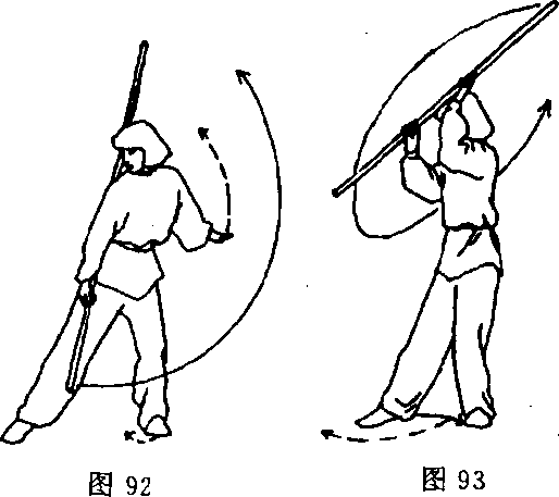 ②身体上起左转,左脚尖略内扣;同时,右手握棍使棍把头向 上方挑棍绕行时左手在头的左侧上方托住棍身;目视斜下方(图 93) o
