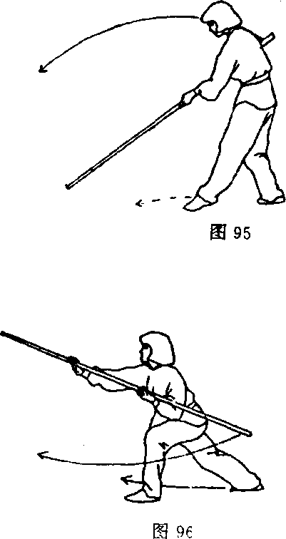 ④步子不变,身体略左转;同时,两手握棍用手将棍梢由身后 向体前下方劈棍;目视棍梢(图95)o