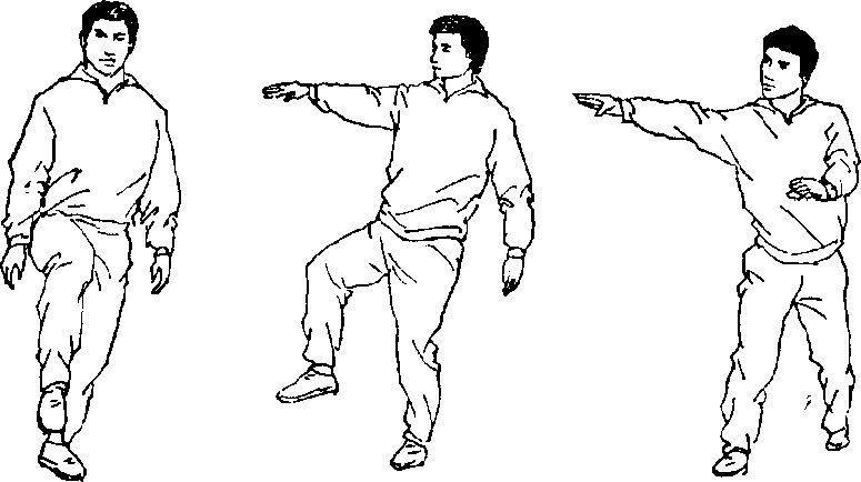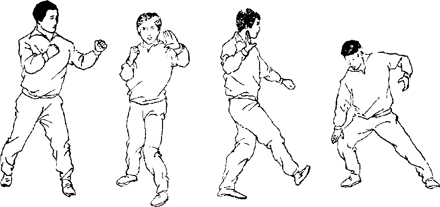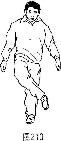 10 .撞切:由丁步姿势开始,右腿屈膝上抬(图207),右臂 向前伸直,右腿向左前摆(图208),右腿向右前上步,上体 挺胸前撞(图209)。用于练习手、脚、上体并用的摔法。