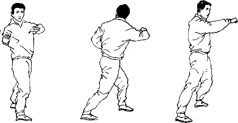 12 .揣空:由立正姿势开始,两脚开立略同肩宽(图 213),盖左步,两臂向左下摆(图214),右转体,两臂向 左后摆(图215),上体向后仰,两臂由左侧向右侧划弧, 右臂至背后,左臂于头上,上体弯腰、低头,两腿蹬直,右 臂背后屈肘,左臂向裆前下伸直(图216)。用于练习身体 前后转体,上下起落的协调性.