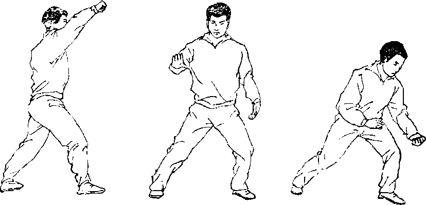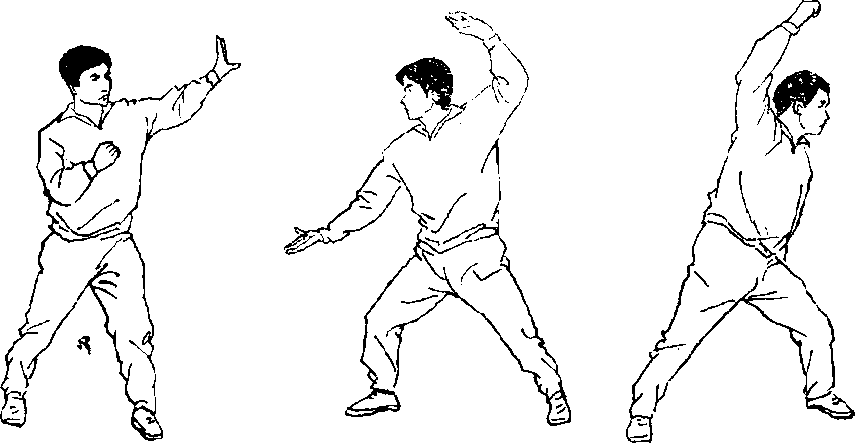 3,拉臂穿裆:由丁步姿势开始,左手向前上挡抓(图 186),向前上右步成右弓步,右手向前下伸(图187),左 手由上向后侧下拉,同时右手上撩屈臂于头上,上体向左移 动成左弓步(图188),用于练习撩裆技术和身体重心的转 移。
