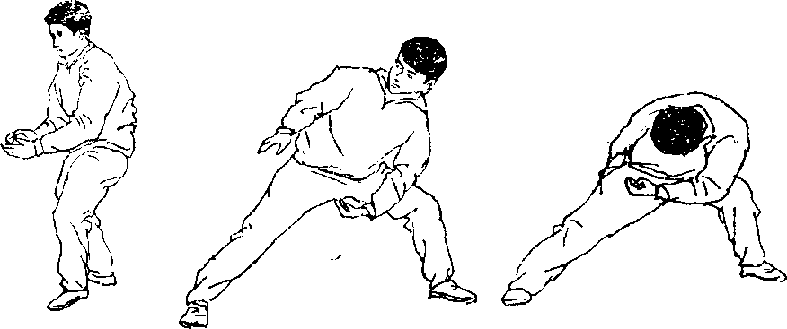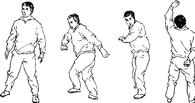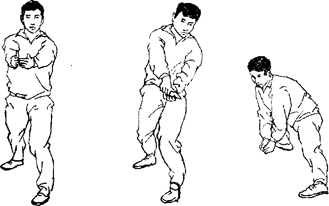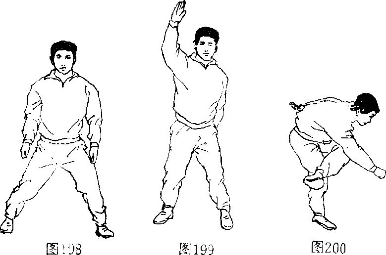 7 .砸搂:由立正姿势开始,两脚开立略同肩宽(图 198),右臂上举,左手后伸(图199)盘左腿、右臂向下 砸,上体左转前下屈(图200),用于练习转体摔法的技术。