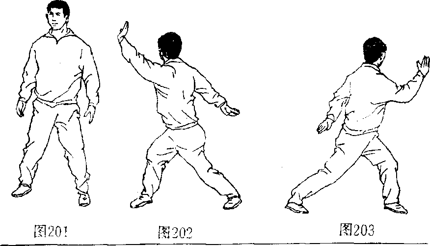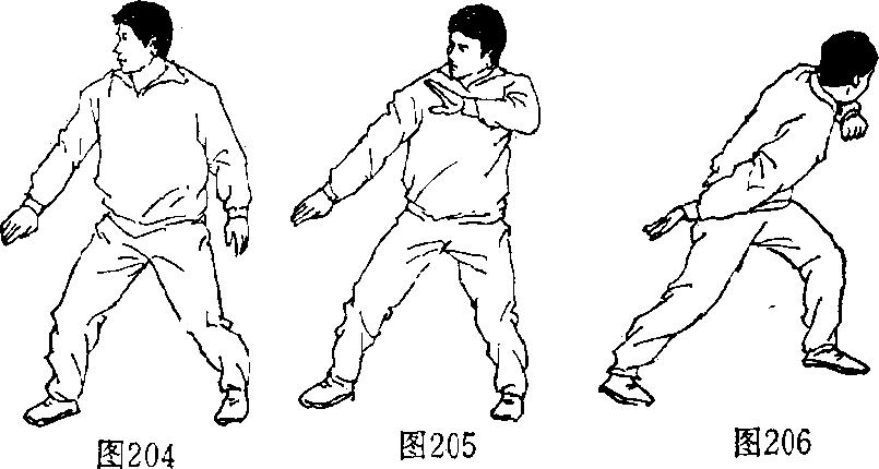 8 .掳空:由立正姿势开始,两脚开立略同肩宽(图 201 ),上体右转90。成右弓步,左手向前伸,右手向后伸 (图202 ),左手向后掳,屈臂于背后,上体低头弯腰,向左 后转,头向后甩,同时右臂屈肘上挎(图203)。用于练习