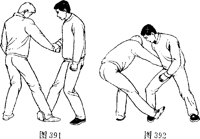 2 .右手向下拉,左腿微屈,右脚背勾住乙右脚跟(图391)。 3,右膝向下跪压乙右小腿(图392)0可把乙摔向后坐,