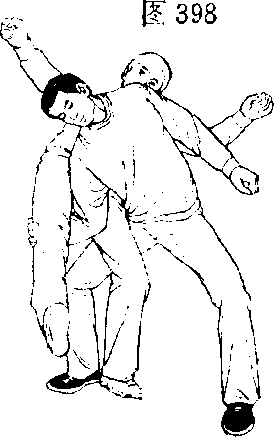 2 .左后转身,左手抓握住 乙右小臂,右手向乙右腿外侧 伸(图395)。