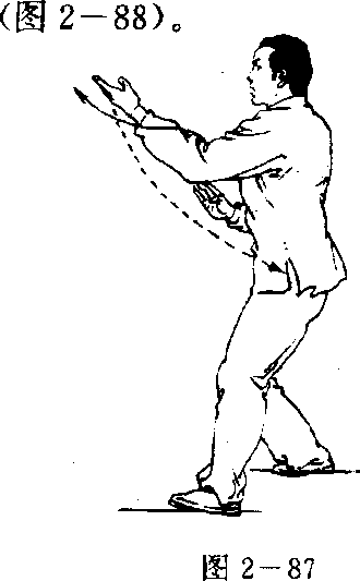 L扣脚落掌 重心移向右腿,左脚尖内扣,上体右转;左 掌翻转落于体前,掌心向上,与肩平,右掌向左划弧后收于左 肘内侧,目视左掌(图2 — 87)。