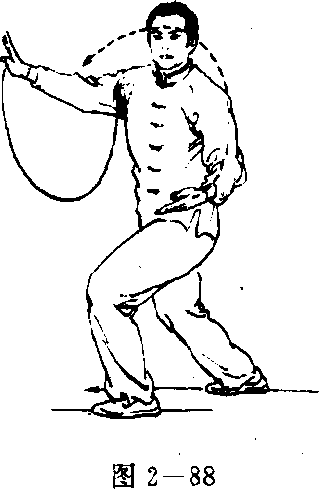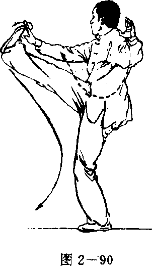 尖蹬出;同时两掌分别右前方和左方划弧分举,两肘微屈,右 臂与右腿上下相对;目视右掌(图2 — 90)。