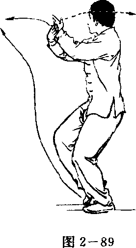 6 .落脚转掌 右腿屈收,向右前方落脚;右掌心转向上, 左掌经腰间伸至右肘内侧;目视右掌(图2—91)。