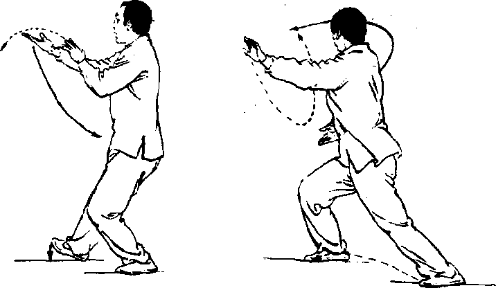 L对方先用左手向我胸部击来,我以右手由左粘其臂向 右后捋带;对方用右手向我胸部击来,则我又以左手臂由左向 右拦截其臂,随即用右手横掌砍其颈部。