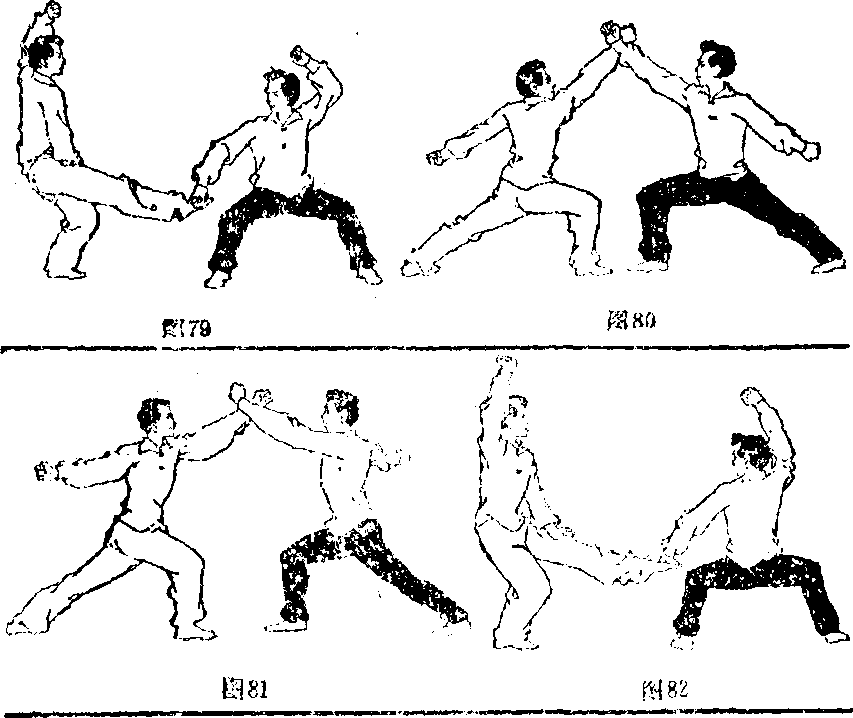 甲,乙二人身体均右转,仍为右弓步手同时甲右臂用力 将乙的右臂压下,摆至体后,举眼向上;左拳由后经上向前 直臂抡劈乙头部,拳眼向上$目视对方头部。乙右臂摆至体后,拳眼向上,同时左臂快速从后经左向 前、向上直臂横击甲左前臂,拳眼向上$目视左拳(图81)。