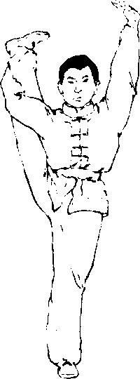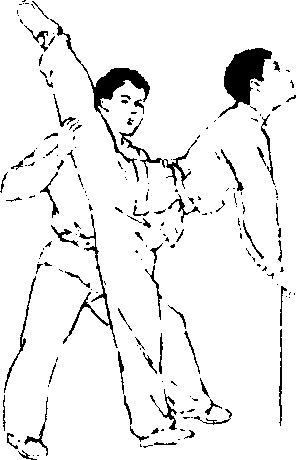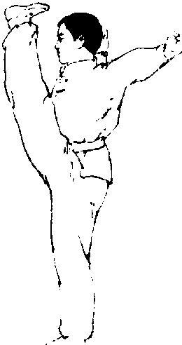 练习方法:左腿挺膝伸直站立,右腿先屈膝上提,右手经 小腿内侧托住右腿跟,向右侧上方肩后搬起,使脚底朝上,脚 尖勾起。左臂上举,在头前左上方成亮掌,目视前方(图4- 103)。如果有同伴帮助,练习者可侧对肋木、双杠等器械或其 他支撑物体站立,右手扶持器械以维持身体平衡。同伴站在练 习者左侧,右腿稍屈,抵住练习者右膝关节处?不让其支撑腿