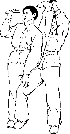 4-110 \然后摆动腿下落,与支撑腿 并立,恢复图的预备姿卦,就 这样在行进中两腿交替练习,