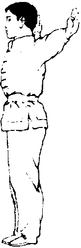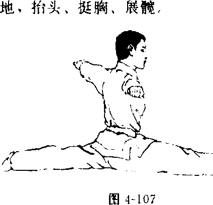 练习方法:两脚并 拢,身体直立,右脚向 前迈一大步,脚尖勾起, 以右郸后侧着地,左腿 Z后伸,以脚背和左腿前 建侧或内侧着地,两臂侧 平举,指尖向上成立:掌 或两手握拳,拳心向下,目视前方(图「107)。