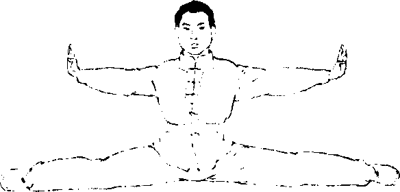 练习方法:两脚并拢,身体直立.两腿同时向两侧直伸滑 开,以两腿内侧贴地.然后,上身挺直,两臂侧平举,指尖向