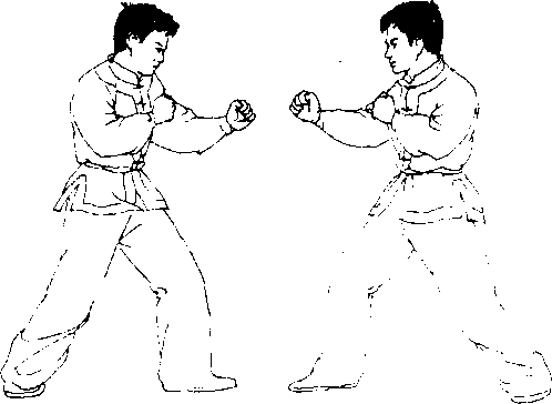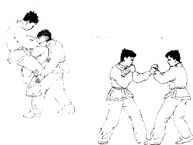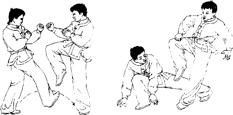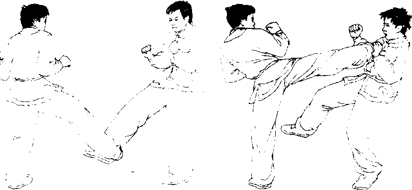 接实战预备式,我右腿先屈后伸弹击对方裆部或小腹,对 方含胸收腹闪防并乘势用两手欲抱我右腿;我身体重心前移,左
