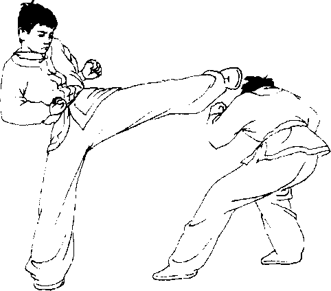 接实战预备式,我身体稍左转,以右脚勾踢对方左腿踝关 节处,再突然上体左倾,右腿屈膝上提变勾踢为侧踹腿,猛踹 对方胸部(图 5-74、5-75. 5-76)。 '