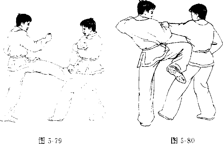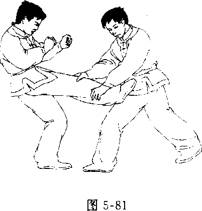两手抓住对方左臂,同时用右膝横撞对方腰部(图5-79、5- 80)。