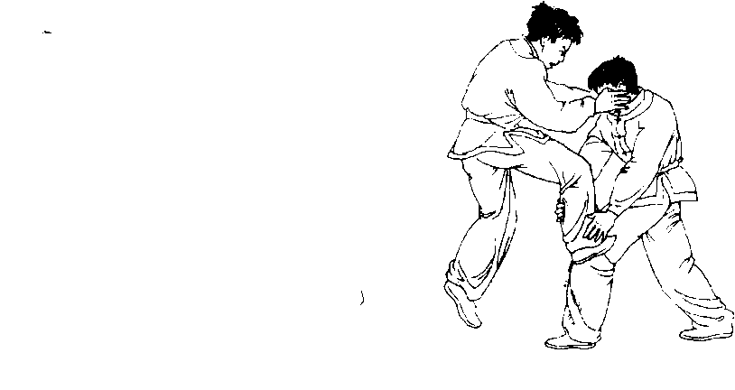 脚蹬地跳起,以右脚踩在对方左大腿上,两手搂抱对方头部,以 左膝向上顶击对方面部(图5-81. 5-82、5-83)o