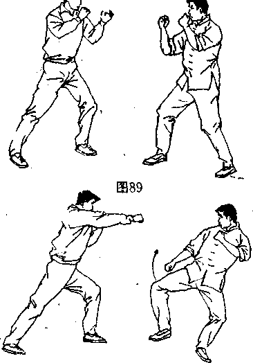 作。一旦对手发起攻击,使~迅速将左脚后撤一步(图卯),以遽 开对手攻击,乘敌立足未稳,迅速提起有膝(图91〉,呼气发力 右脚踹出猛击对手中盘(图92〉,攻将其踢翻在地。