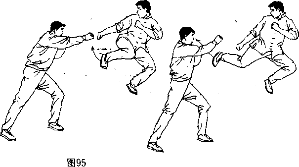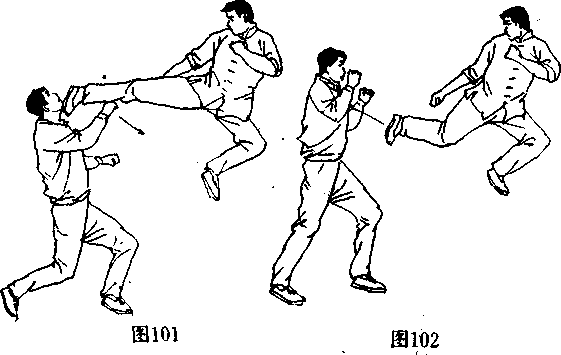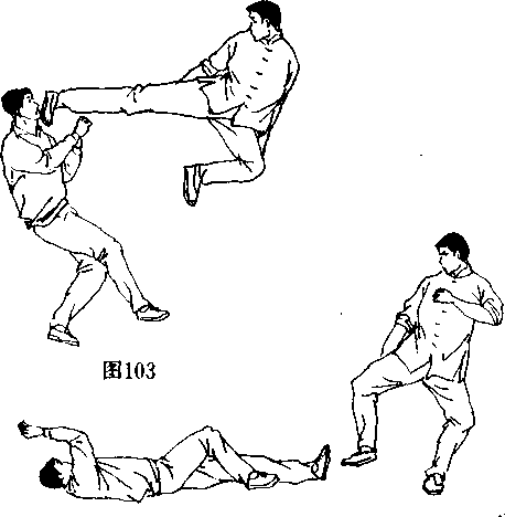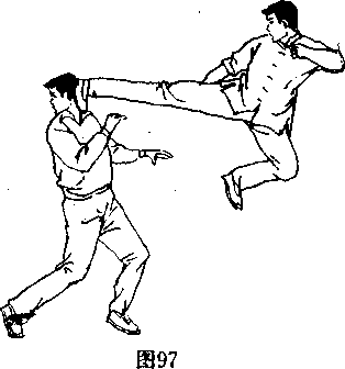 (图96、97〉,并将其踢伤或踢倒在地,双脚落地时要稳,保持 全面的戒备。