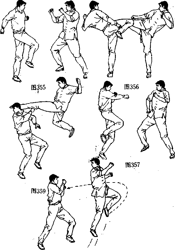[动作要领]李小龙正准备进攻时,对手突然冲了过来(图 355〗,李小龙便对准对手攻出的腿法(或膝法)打出迅猛的右 横撞膝(图356〉,右脚略点地稳定重心后(图,357〉,再腾空跃 起(图358〉,身体向左后方旋转180%将左脚反扫向其头部 (图359〉,如对手低头避过时(图360〉,李小龙右腿再由外向 里成弧线猛力向正前方扫踢,重创其头部(图361〕。