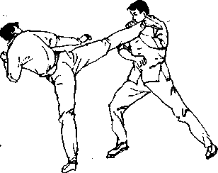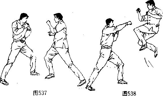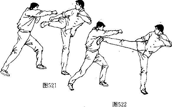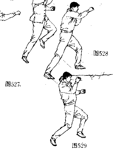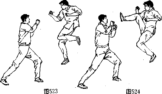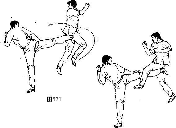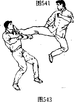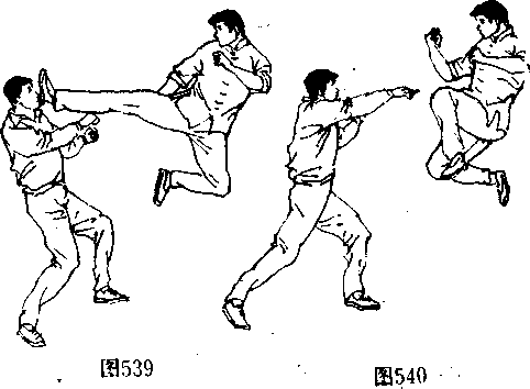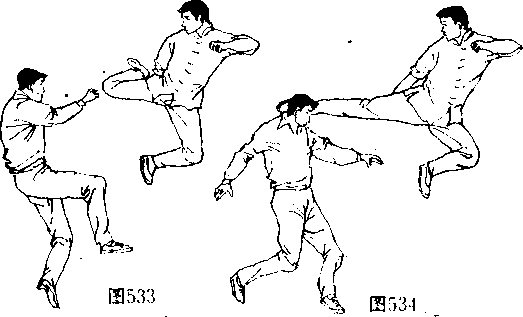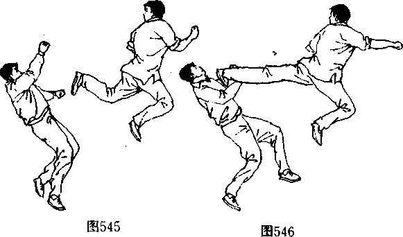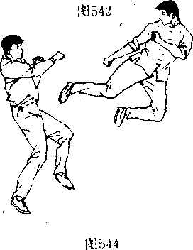 (阄542、543〕并在双脚落地前的瞬间(图544 向左后方转 体,攻出一记直踹腿狠击对手“部或面部〔图545、546〉。