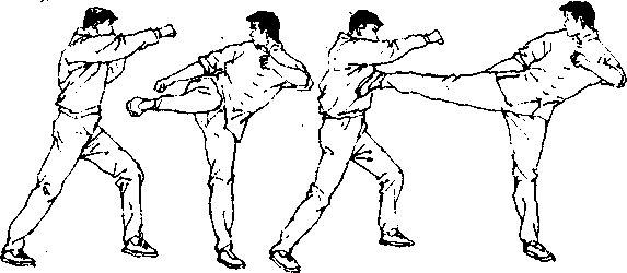 [动作要领]李小龙先用前手吸收对手注意力,迅速抬、起 右脚(图535〉,用侧踹腿猛击对手中盘(图536〉,将其迫退(图 5370,然后腾空跃起(图538〕,用右正踹腿重击对手头部(图 539〕,右脚回收的同时(图540〉,再用左正踹(或侧踹)攻击对 手中盘或颈部(图541〕,再角腾空右正踹腿踢向对手上盘