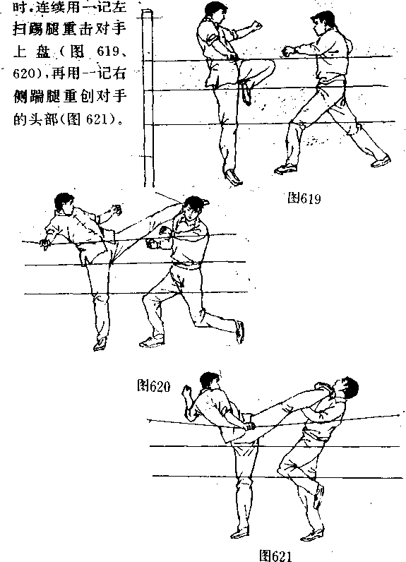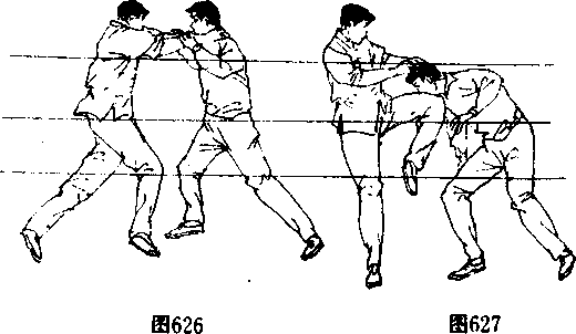 其颈部猛力下扣,将右膝猛力撞向其肋部(图625〉,在落稳右 脚的同时(图626〉,用左侧撞膝重创对手中盘(图627〉,最后. 换用右弹踢腿狠踢对手下颏(图628〉。