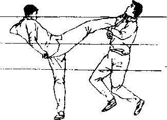 [动作要领]搏击中,利用场台边绳索的附加支撑力量,施 展足技,比不利用绳索支撑而单独施技时,威力要大三倍。格 斗中,当对手挥拳冲来时,李小龙抬起右脚用侧踹腿猛击手 膝盖或大腿(图61^〉,接着,李小龙在用右手猛拉绳索的同