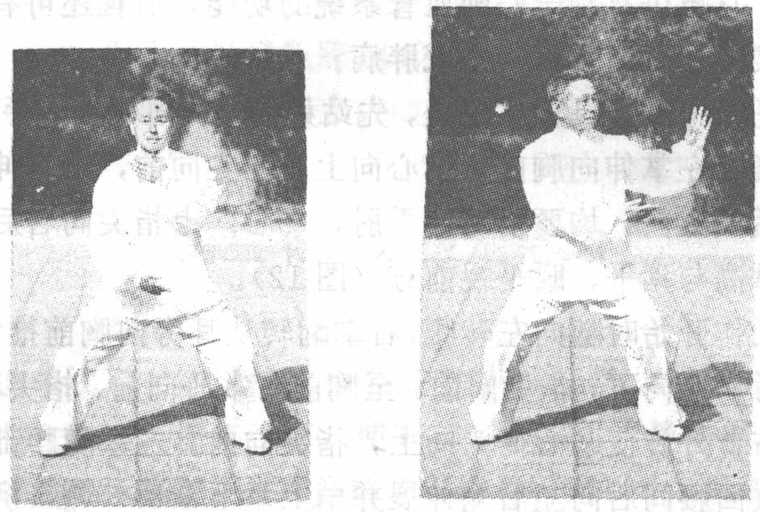 马步云手的具体练法是,两足平行开立,两足相距较无 极桩稍宽,两腿屈膝下蹲,两膝仍应在两足尖之上,即两小 腿应与地面垂直。马步要求两大腿要平,我们以健身为本,对 此无需严格要求,只要能站稳即可。两掌似无极桩屈肘相抱, 但一手(如左手)在胸前,一手(如右手)在腹前,两臂要 搠圆,掌心均向里,眼平视前方(图9)。