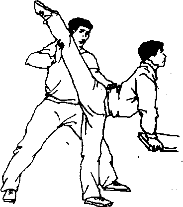 [:作用]强行拉长腿前部韧带、肌肉等,使后踢腿灵活自 如。