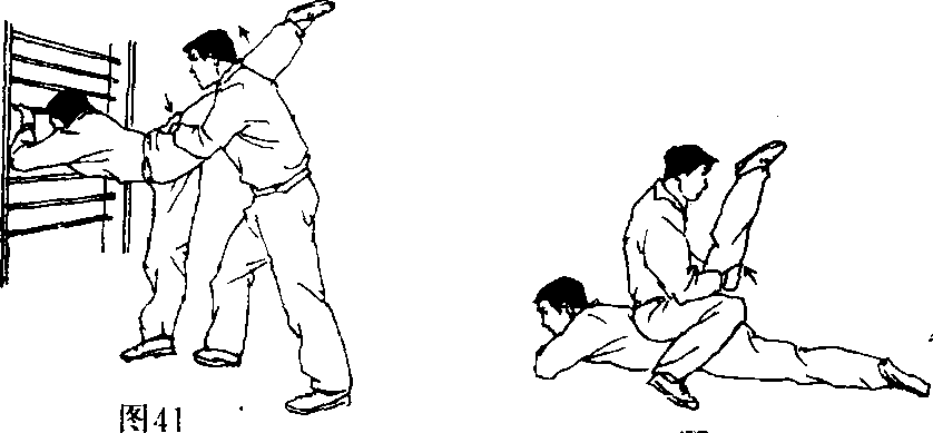 也可以肩扛着练习者膝关节上方,向上推其腿,同时双手 下搬其大腿根部(图41)。练习者俯卧,助手也可以坐在练习 者腰部?双手向后搬其膝上方(图42)。