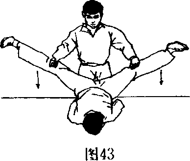 [动作1练习者俯卧在垫子上,助手将练习者两腿左右分 开,然后向下压(图43)。
