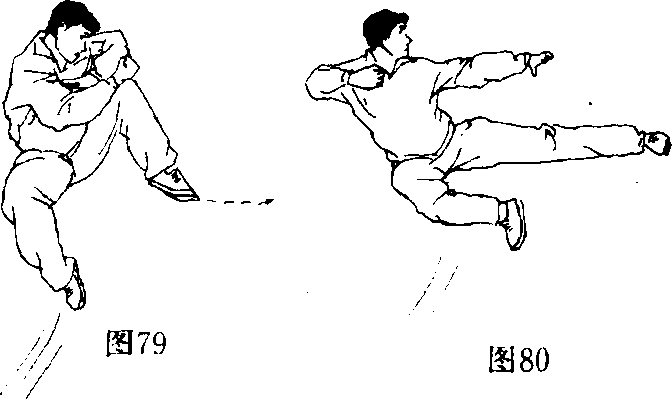 [动作]右脚脚尖外展向前上步, 同时两臂后摆,随之重心下降;右腿 向前上方起跳,左腿屈膝高提,左肩 在前,身体腾空,随即左脚向前侧踹 (图78、79、80),左右腿交替练习。
