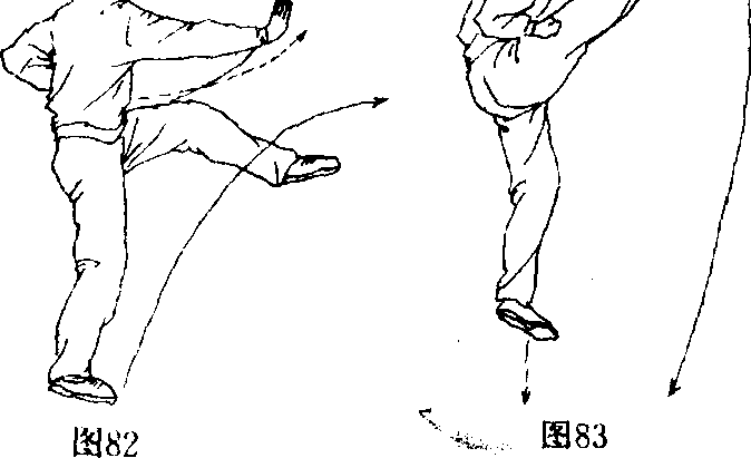 [动作1右脚向前上步,左腿 向前上摆起,同时右掌,向前推出 (图81、82),右脚起谦,身体向 前上腾起,同时右腿向前上弹 踢,脚面绷直,左掌向前推出,目 视前方(图83)。左右脚依次落 地成右脚在前点步。