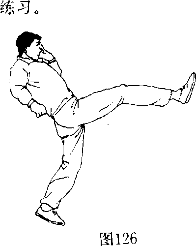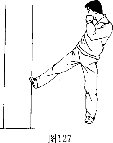 (1)练习者用正、侧、后踹腿踹击柱子、大树或墙等(图 126)。