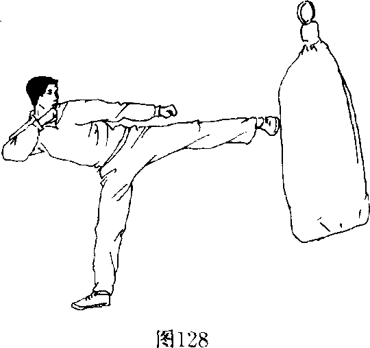 (3)练习者用正、侧、后踹腿踹沙袋(图128),待熟练后可 配合步法、手法练习,如果准备活动做好可发全力踹沙袋。沙 袋悠起来回摆时迎踹沙袋。