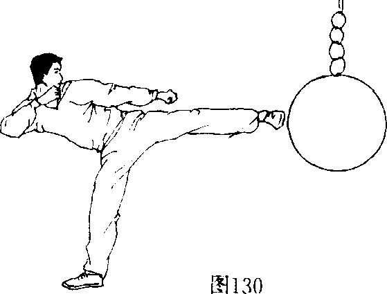 (4)练习者用侧丁腿接侧踹踹击吊在空中的球(图129、 130) o也可以直接用各种踹腿踹球。还可以用丁腿接正踹踹 球。还可以配合步法、手法踹球。