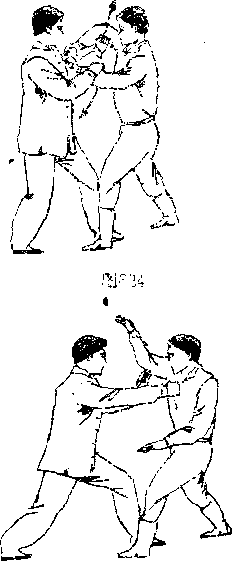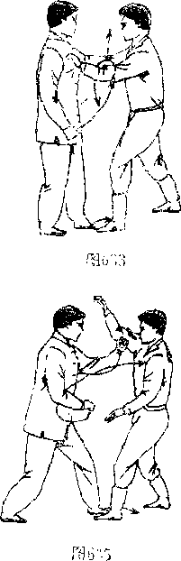 乙方上步出右直拳击回甲胸,甲方迅速出双手向上七截 (图6:“).右手施拦切其腕,并抓住向F压盖;左手立掌仄中