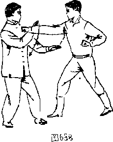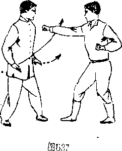 向上挑架4左手臂(图638.639),随即甲方左脚迈步、右脚跟 步而进身追靠口双手不变势,右手抓握乙手腕顺劲向前推压其 胸,使乙方左手臂受乱制而翻屈抵制匚(图64。)
